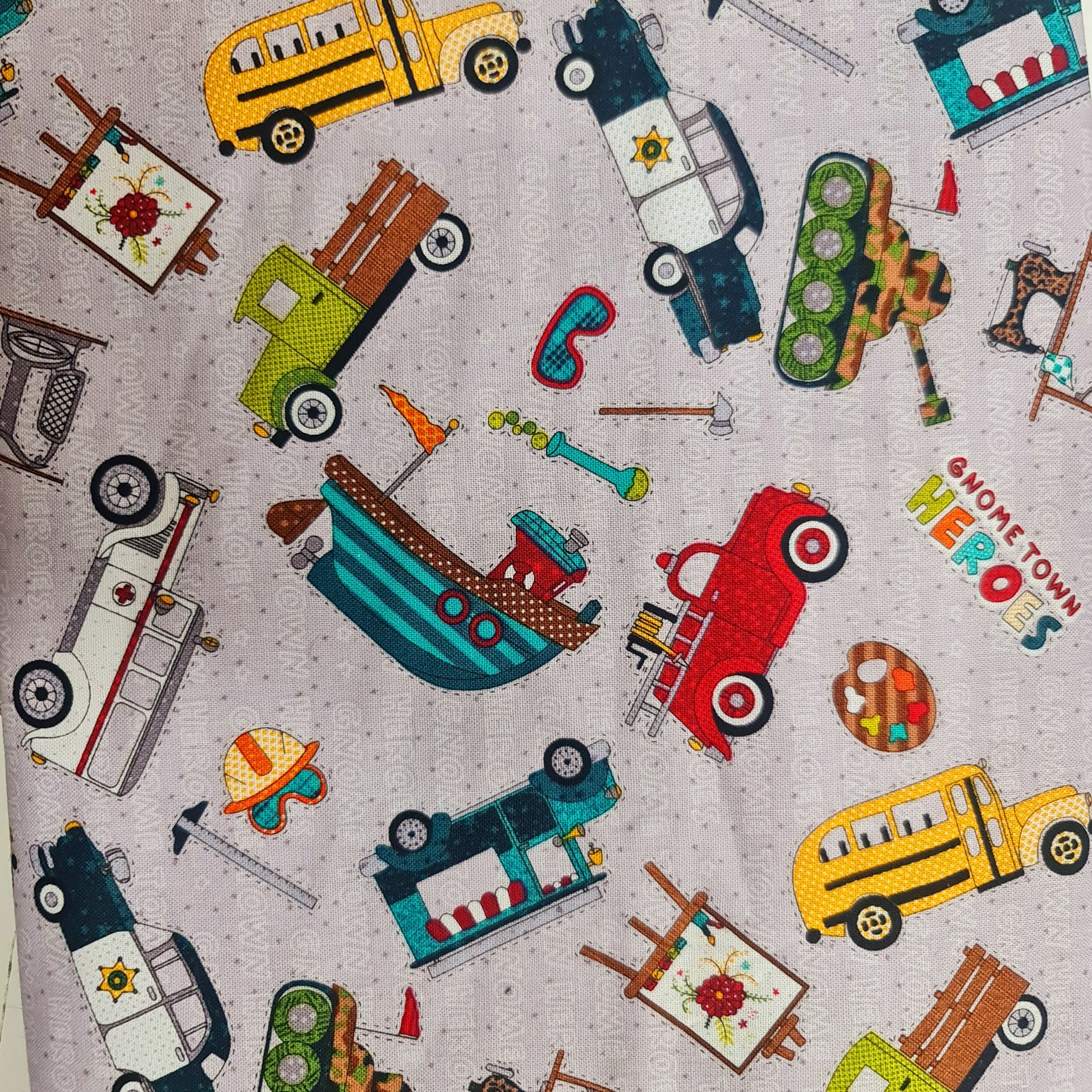 Tela de algodón infantil vehiculos "gnome town heroes"