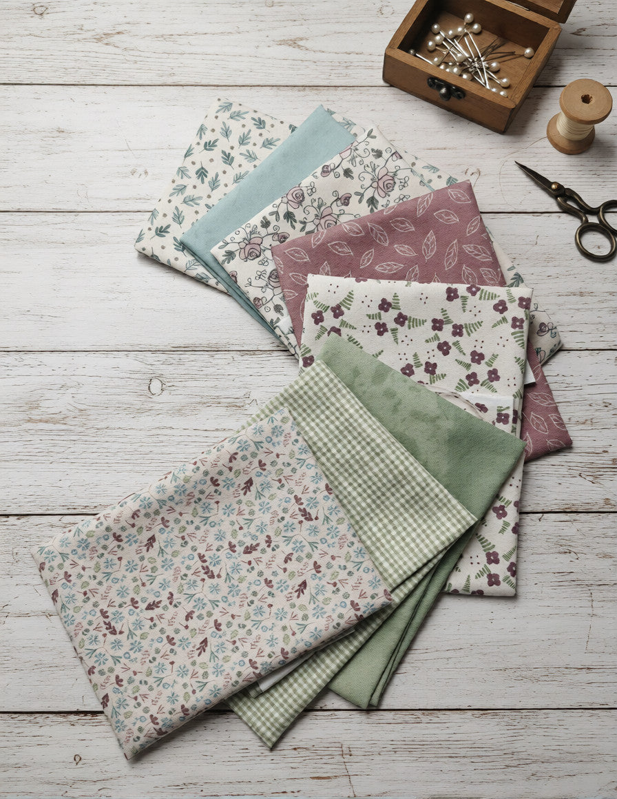 8 rectángulos de 25 x 42 cm listos para tus proyectos de patchwork, quilting y costura creativa. Cada tela ha sido cuidadosamente seleccionada para crear composiciones equilibradas y llenas de encanto.
